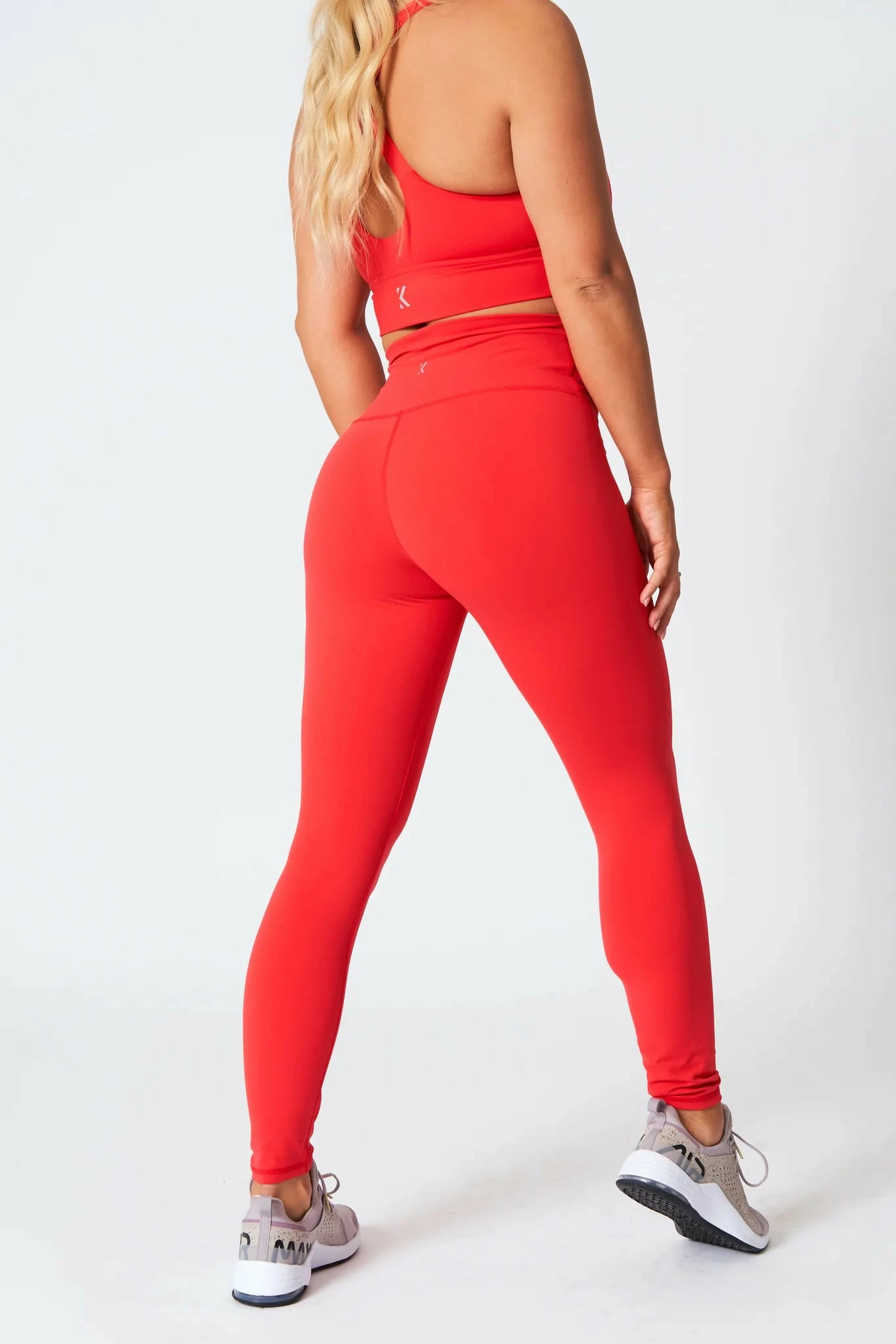 Model is wearing the Pilot legging in Fire Red in the size XS.