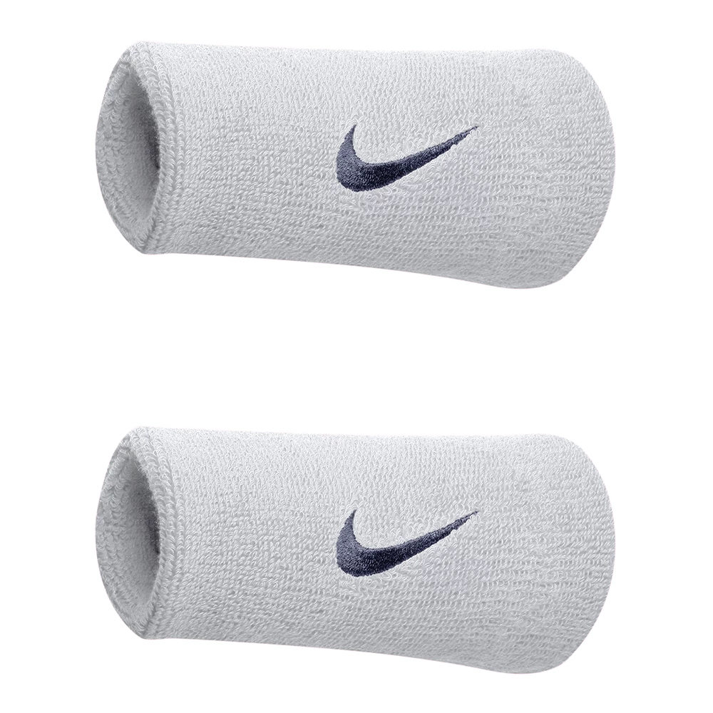 The Nike Swoosh doublewide wristband is made from an absorbent cotton/nylon/spandex blend with embroidered Nike Swoosh. 2 per pack. 5 inch.