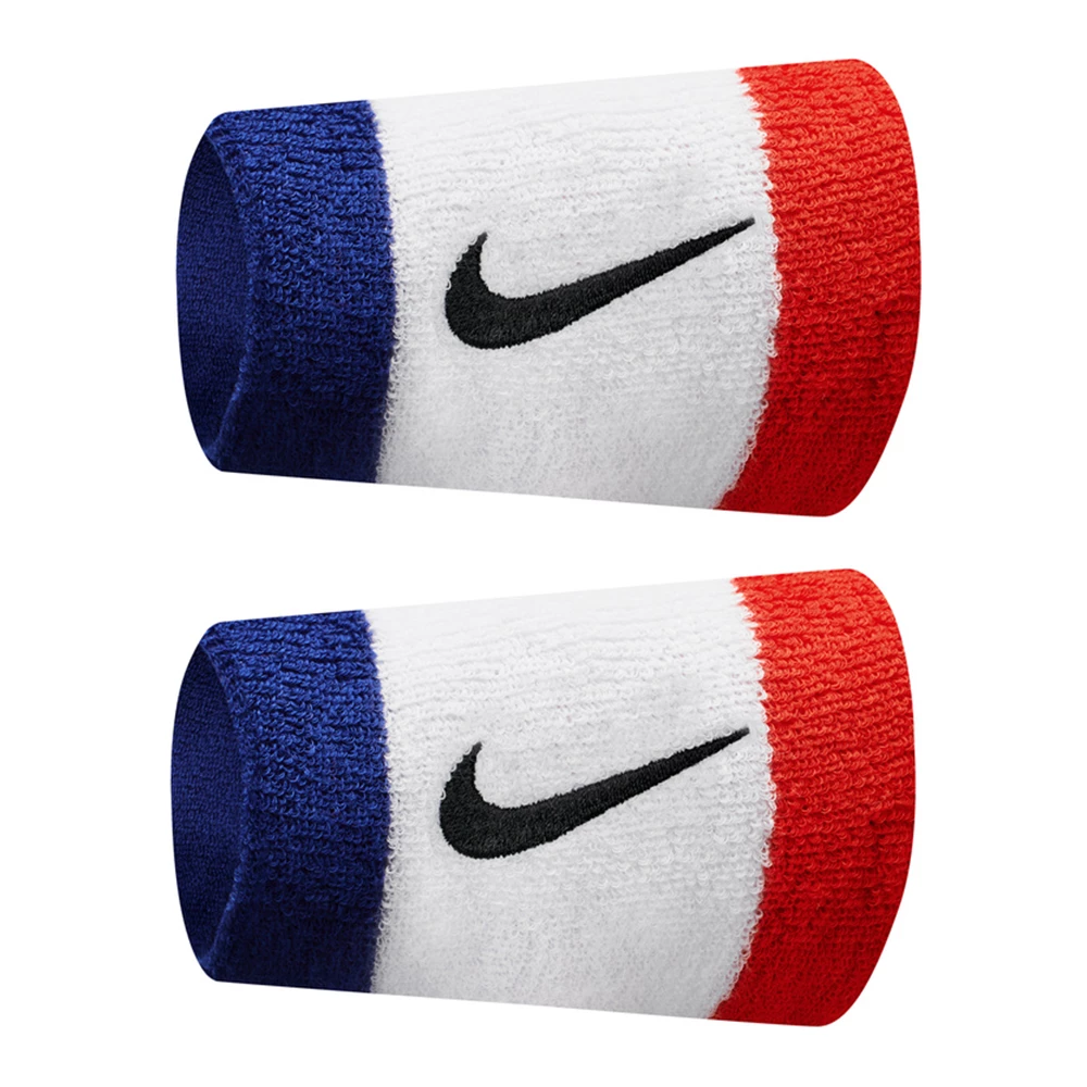 The Nike Swoosh doublewide wristband is made from an absorbent cotton/nylon/spandex blend with embroidered Nike Swoosh. 2 per pack. 5 inch.
