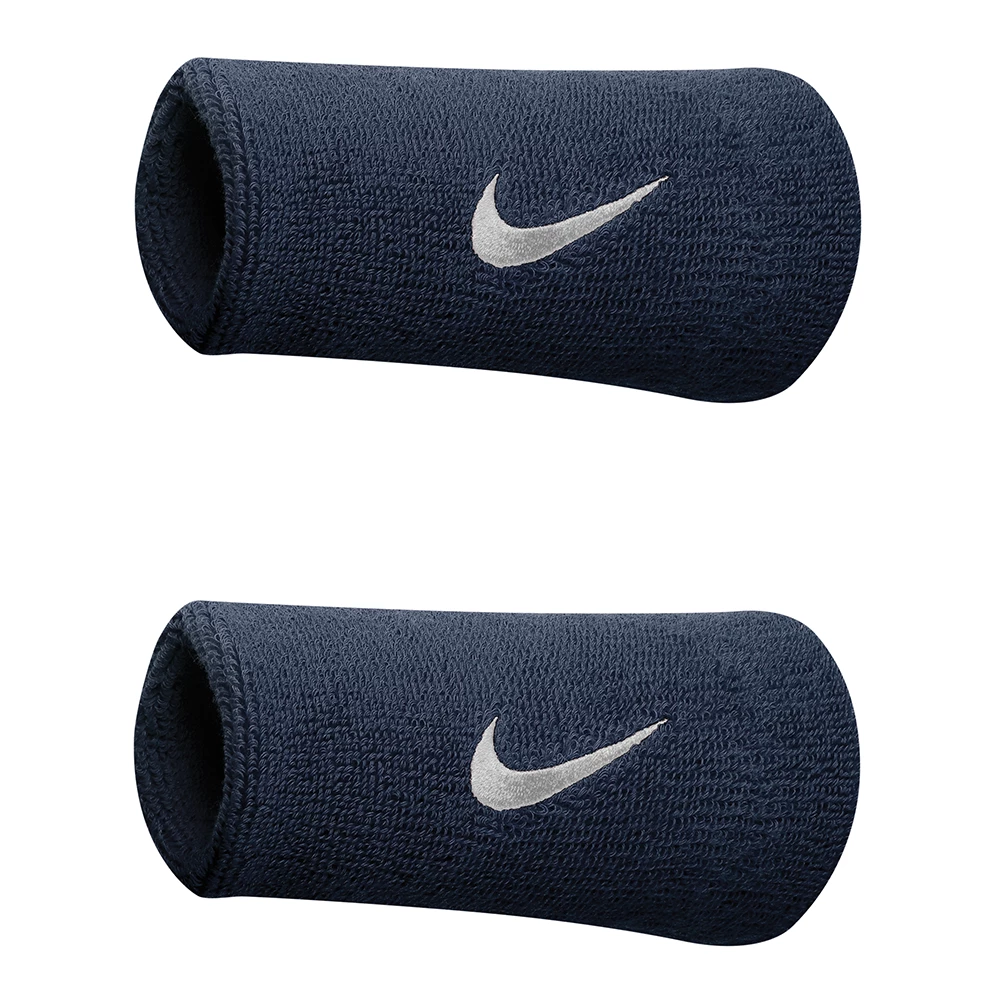 The Nike Swoosh doublewide wristband is made from an absorbent cotton/nylon/spandex blend with embroidered Nike Swoosh. 2 per pack. 5 inch.